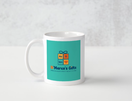 The sleek white body with a vibrant turquoise panel showcases the Di’Marco’s Gifts logo, spreading awareness and positivity with every sip. Its comfortable handle ensures a secure grip, while the smooth finish makes it both microwave- and dishwasher-safe for convenience.